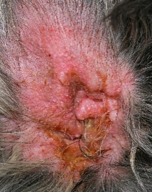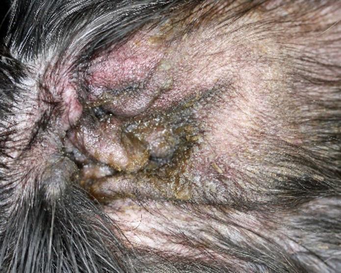 Eritema grave y posibles ulceraciones del oído externo con exudado purulento