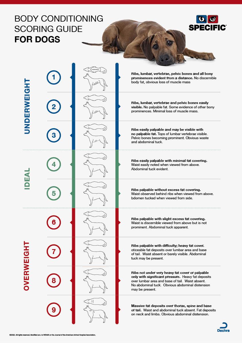 - Show the dog owner how to check for their dog’s ribs. Also, there are now on-pack body size checkers on many petfood products to help dog owners easily assess their dog’s weight.