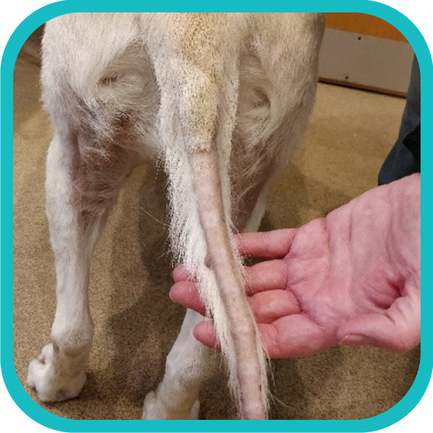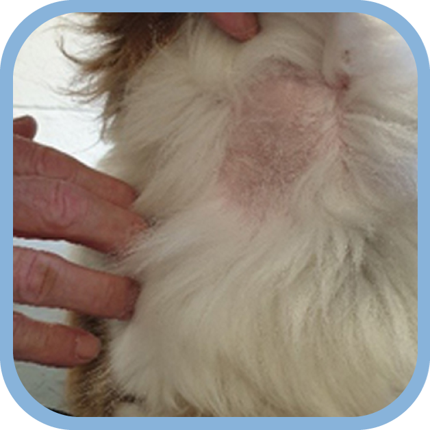 - Alopecia (pérdida de pelo, sobre todo en los flancos y las extremidades). Tenga en cuenta que las condiciones de dermatitis atópica/pruriginosas NO suelen estar asociadas a este tipo de alopecia. La elevada producción de glucocorticoides de la corteza adrenal como parte de este trastorno "enmascara" cualquier picor)