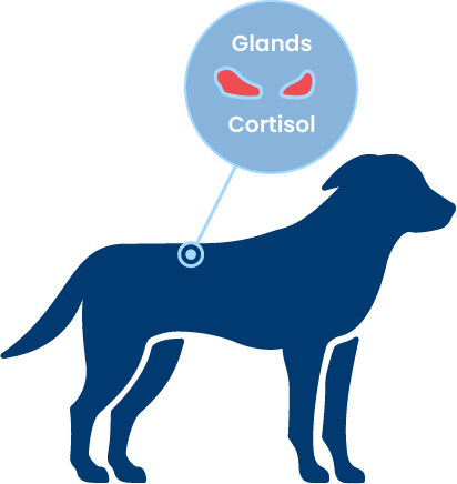 El cortisol se produce en la zona fasciculada y la zona reticular de la corteza adrenal. En el perro normal, la liberación de cortisol es estimulada por la hormona adrenocorticotrópica (ACTH), que es liberada por la glándula pituitaria anterior. La liberación de ACTH está regulada por la hormona liberadora de corticotropina (CRH) secretada por el hipotálamo.